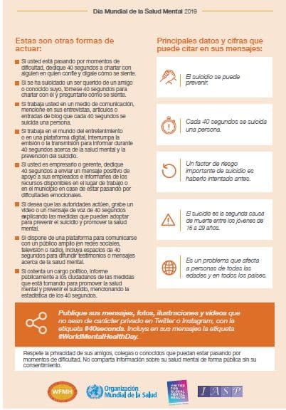 Esta efeméride, que anualmente busca visibilizar la importancia de la salud mental para el bienestar de las personas, ha servido para el lanzamiento de la campana de la OMS “40 segundos para actuar”, dirigida a ofrecer a la población común y a las y los profesionales de la salud información útil para contribuir a la prevención del suicidio.